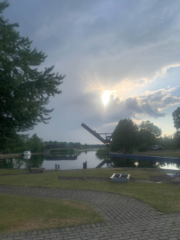 La nuit tombée, on décide de retourner aux écluses. Disons que le vélo la nuit, ce n’est pas mon activité préférée, surtout dans le noir complet. Ma lampe frontale avait cassé plus tôt dans le voyage, les lampadaires n’étaient pas allumés et Léon, seule source de lumière devant moi s’est pris pour Max Verstappen et a tracé. Simply Lovely.