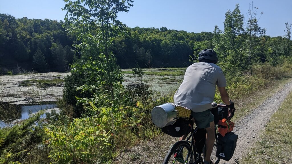Le neuvième jour on change de décor. On quitte les routes classiques pour emprunter le Cataraqui Trail direction Chaffey’s Lock. Les paysages sont diversifiés : il y a de la forêt, encore de la forêt et puis… de la forêt. Parfois des marécages, des lacs, des rochers mais surtout de la FORÊT. Blague à part c’est un trail très agréable visuellement même avec la tête qui secoue en permanence.